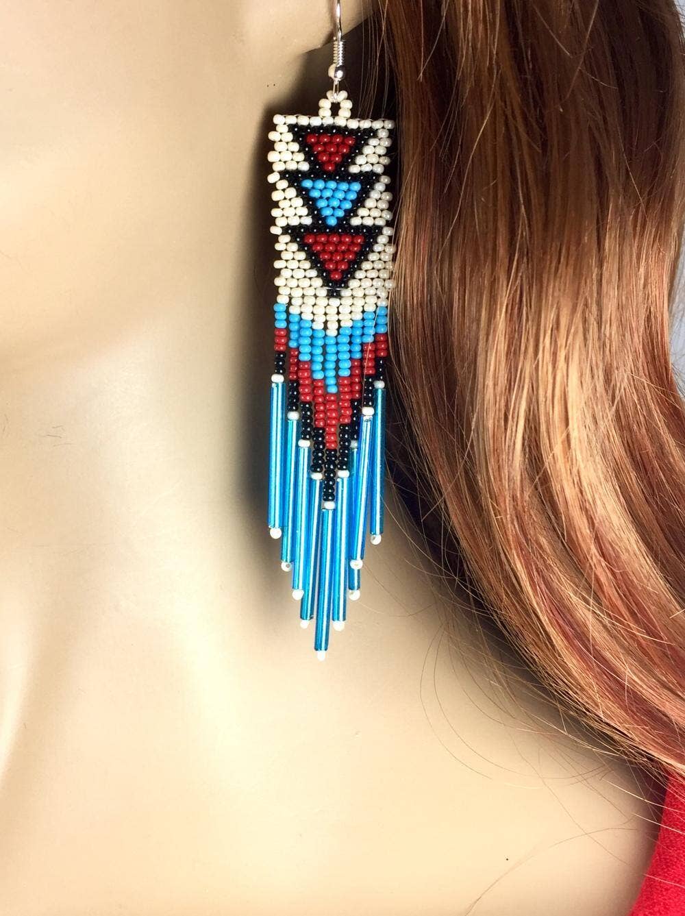 Handmade beaded Cream Blue long Native Style Geometric design Hook Earrings